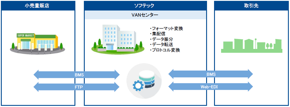 当社では流通システムにおけるVANサービスを提供しております。 Web-EDI、流通BMS、の通信プロトコルに対応した「高信頼・高品質・低価格」なVANサービスとして、小売量販店様と取引先様における電子取引業務(EOS/EDI)を強力にサポートします。